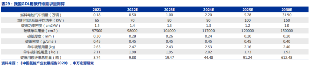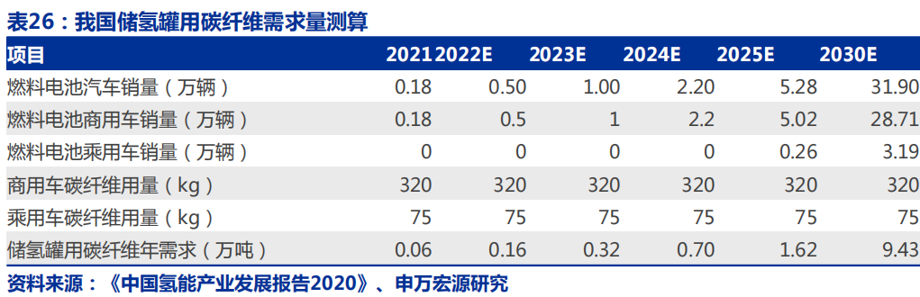 测算得出2025/2030年我国储氢罐用碳纤维需求量可达1.62/9.43万吨。据《2020全球碳纤维复合材料市场报告》,全球范围内压力容器碳纤维需求2025/2030年可达2.19/18万吨。