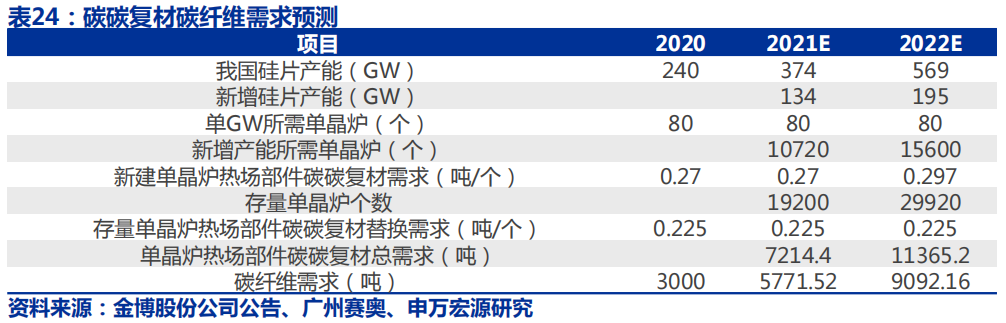 碳/碳复材主要应用于刹车盘、航天部件、热场部件三大市场,其中刹车盘、航天部件市场需求基本保持平稳,热场部件主要应用于单晶拉制炉、多晶铸锭炉热场系统中,单晶拉制炉、多晶铸锭炉用于光伏和半导体晶硅制造,受益于光伏市场高速增长,热场部件需求量迅速增长,导致2020年我国碳碳复合材料碳纤维需求量同比增长150%。热场部件属于耗材,受下游光伏行业的增长以及碳碳复材在热场系统中渗透率提升,碳碳复材需求有望保持快速增长。据《2020全球碳纤维复合材料市场报告》,2025年全球范围内碳碳复材碳纤维需求量达18565吨,2020~2025年CAGR为30%
